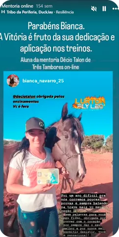 Depois de anos dentro da arena, Décio decidiu transformar tudo o que aprendeu em um método ensinável. Assim nasceu o Método Décio Talon, que já ajudou mais de 2.000 alunos em sua mentoria online, a baixarem seus tempos com segurança, responsabilidade e respeito ao cavalo, no Brasil e em outros 9 países.