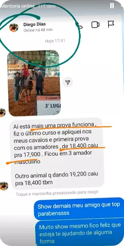 Espaço exclusivo para tirar dúvidas sobre exercícios, plano de treinos, adaptação à sua realidade e evolução do seu cavalo, sem precisar “quebrar a cabeça” sozinho.