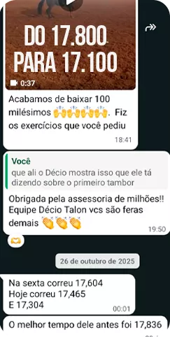 Você envia suas passadas em vídeo seguindo as orientações da mentoria. Dentro do cronograma, o Décio (pessoalmente) faz a análise, aponta onde você está perdendo tempo, o que precisa ajustar e quais exercícios focar nos próximos treinos.