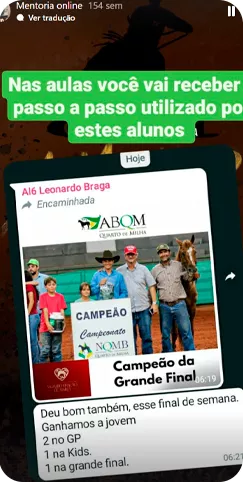 Você entende o processo de evolução, aprende a fazer escolhas mais assertivas (treinador, provas, cavalo) e sabe exatamente o que cobrar, como apoiar e em quanto tempo esperar resultado real.